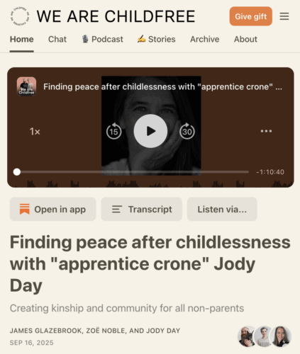 [SEP 2025] Jody Day interviewed by Zoe Noble from We Are Childfree on finding peace after childlessness (and a whole lot more!). Listen on the WeAreChildfree website, on its Substack, on ApplePods, on Spotify, etc.